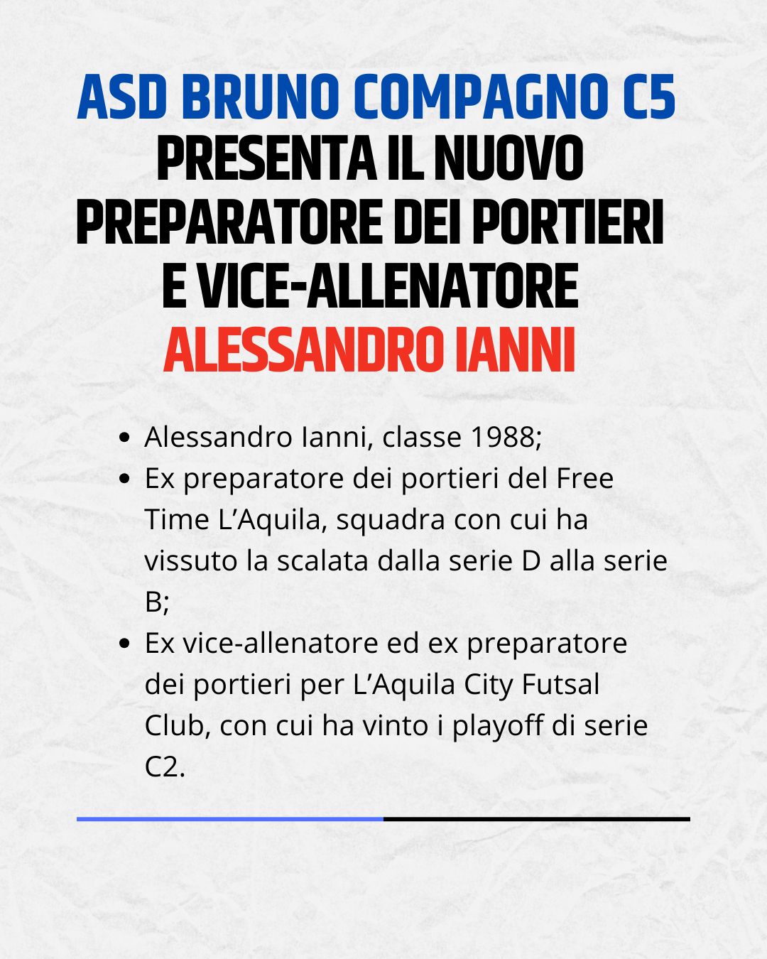 Colpo da 90 per la panchina della ASD Brino Compagno Avezzano C5 militante nella serie C2 A abruzzese. In panchina è ufficiale l'arrivo di Maurizio Merola classe 1979 (in foto) ex tecnico della Free Time l'Aquila. Al suo fianco ci sarà il preparatore dei portieri e vice allenatore Alessandro Ianni, classe 1988. La società augura buon lavoro ai mister.