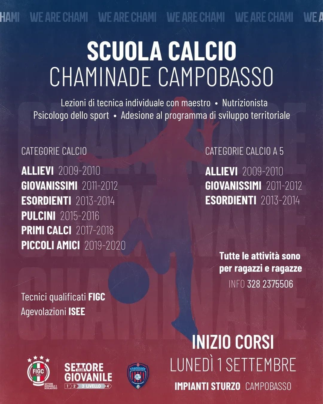 Per una città che ama il calcio, la Scuola Calcio Chaminade Campobasso è una certezza: ogni anno, nuove generazioni trovano qui uno spazio sano, qualificato e stimolante dove costruire il proprio percorso sportivo e personale. Per informazioni sui corsi, modalità di adesione e agevolazioni, è possibile contattare la segreteria al numero 3756630543 - 328 2375506.