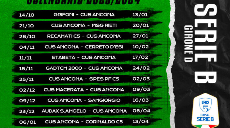 La prima in casa dei Grifoni, l’ultima al PalaCus con il Corinaldo. Dopo i gironi la Divisione Calcio a 5 ha diramato anche i calendari del campionato nazionale di serie B. Campionato che prenderà il via sabato 14 ottobre alle ore 16 con il Cus Ancona che sarà impegnato sul campo dei Grifoni a Spello (PG). A distanza di una settimana il debutto in casa contro MSG Rieti. A seguire la trasferta di Recanati e siamo al 28 ottobre, mentre per il 4 di novembre turno in casa con il Cerreto D’Esi.
