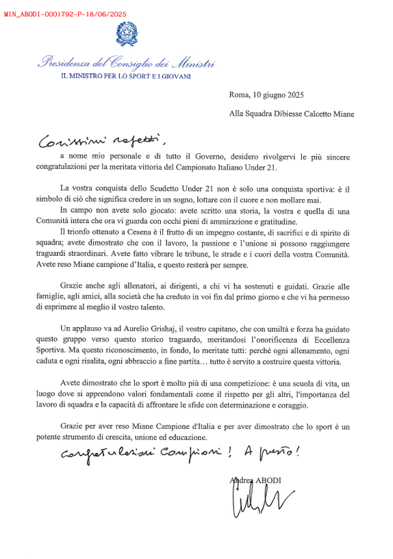 Durante il match tanti interventi decisivi, poi nel primo tempo supplementare il cartellino rosso che ha rischiato di creare uno psicodramma per lui e i compagni. Alla fine però la squadra si è difesa bene portando a Miane lo scudetto Under 21. A distanza di quasi tre settimane dal successo tricolore ottenuto a Cesena nella finale vinta con il Club Sport Roma, abbiamo voluto rivivere nuovamente le emozioni di quella gara con uno dei protagonisti dell'incontro, il portiere di origini brasiliane Kaua Lupo. Nel mentre, negli ultimi giorni pure il ministro dello sport Andrea Abodi si è congratulato con il club trevigiano attraverso una lettera ufficiale consultabile nella gallery a fine articolo.