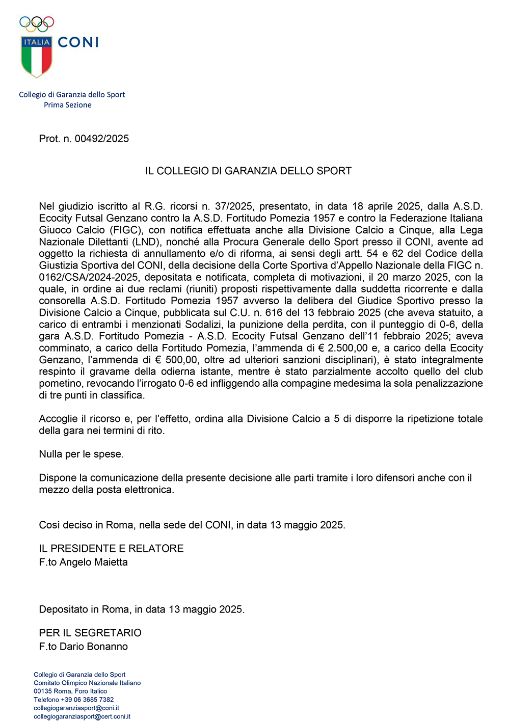 Si ripeterà integralmente la partita di campionato tra Fortitudo Pomezia e Genzano, che come si ricorderà era stata oggetto della decisione del giudice sportivo della Divisione Calcio a 5, e successivamente della Corte Sportiva d’Appello, che avevano alla fine disposto la vittoria a tavolino per 6-0 della Fortitudo, contestualmente penalizzata di tre punti in classifica.