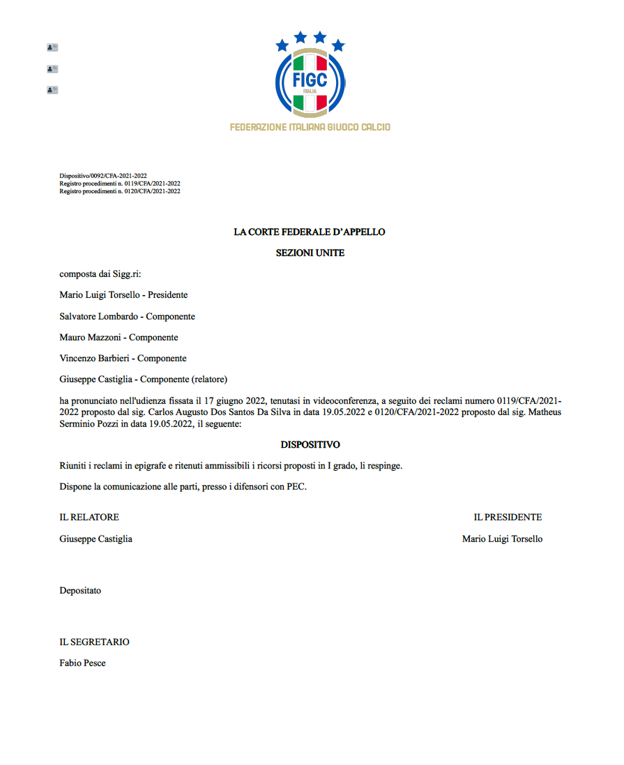 Era previsto che anche il ricorso presentato alla Corte Federale d’Appello da Kakà e Pozzi tramite l’avvocato Michele Cozzone, venisse respinto. Il noto legale di Isernia, pur dichiarandosi possibilista, non si aspettava che l’alto organo giudicante della FIGC potesse ribaltare la decisione del Tribunale Federale Nazionale che aveva ritenuto i ricorsi presentati dai giocatori inammissibili.