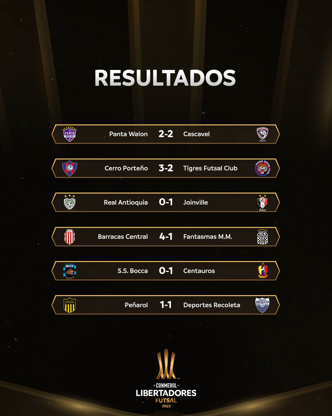 Oggi intanto si giocano proprio Peñarol-Deportes Recoleta, Cascavel-Cerro Porteño, Tigres-Panta Walon, Joinville-Barracas Central. In campo anche i boliviani del Fantasmas Morales Moralitos opposti ai colombiani del Real Antioquia.