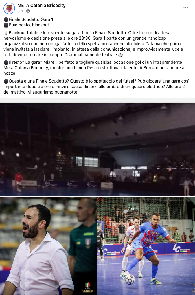 IL COMUNICATO DELLA META CATANIA (LEGGILO NELLO SCREENSHOT IN GALLERIA IMMAGINI)- “Blackout totale e luci spente su gara-1 della Finale Scudetto. Oltre tre ore di attesa, nervosismo e decisione presa alle ore 23,30”.