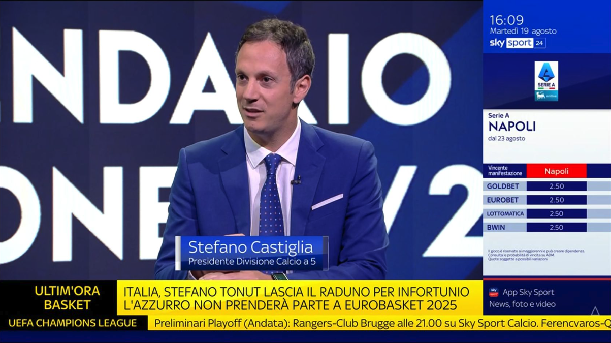 E’ stato il presidente della Divisione Calcio a 5, Stefano Castiuglia, a premere il pulsante virtuale, come lo ha definitivo il conduttore di Sky e voce del futsal, Daniele Barone, che ha dato il via all’elaborazione del calendario del campionato italiano di Serie A numero 42, che scatterà il prossimo 27 settembre. Il sipario, dunque, si è alzato presso gli studi di Sky Sport 24, a Milano, alla presenza (in collegamento video) del capitano della Meta Catrania bicampione d’Italia, Carmelo Musumeci.