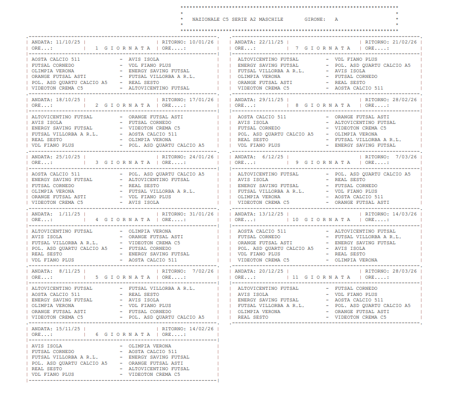 Con il comunicato ufficiale n.12, la Divisione Calcio a 5 ha formalizzato il calendario della Serie A2 2025-2026. Si parte l’11 ottobre, mentre la linea del traguardo è fissata al 28 marzo. Come annunciato nel c.u. n.11, il girone D è stato rimodulato a 10 squadre, con la Roma Calcio a 5 inserita nel girone E di Serie B.