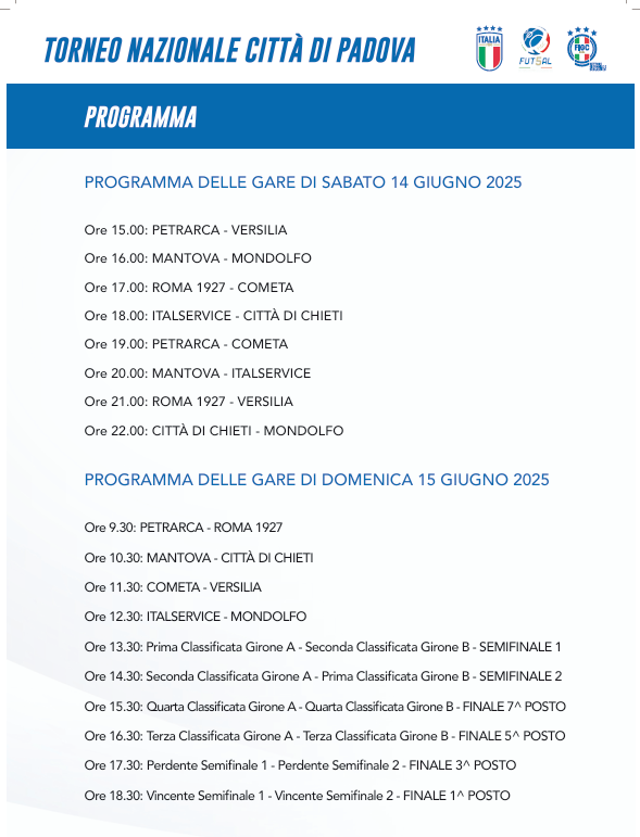 E' andata in archivio la prima giornata del Torneo Nazionale Città di Padova Under 17, giunto alla sua sesta edizione. Oggi sono andate in scena le prime due "giornate" della fase a gironi che si completerà poi domani, prima delle due semifinali e delle quattro finali che determineranno gli otto piazzamenti conclusivi. Di seguito il report della partite di sabato con classifiche dei gironi e tabellini dei match.