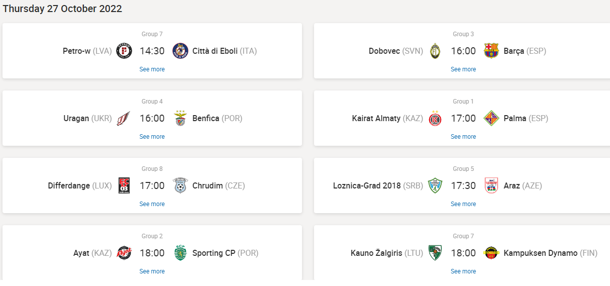 Tanta attesa anche per il derby tutto croato tra Pula e Novo Vrijeme e per la sfida tra Uragan e Benfica. Lo Sporting Lisbona nel gruppo 2, infine, saggia le ambizioni dell'Ayat, temibile compagine del Kazakistan. Per le sfide di oggi pomeriggio vedi galleria 1, per le partite di questa sera vedi galleria 2.