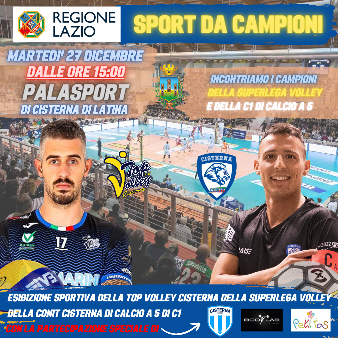 Sarà un pomeriggio di Sport e Inclusione, insieme ai Campioni della Top Volley Cisterna e alla Conit Cisterna di Calcio a 5, quello promosso e organizzato dalla Regione Lazio ed il Comune di Cisterna di Latina, con la collaborazione del Settore Giovanile della Cisterna Calcio, della Body Lab con la scuola di danza di Monica Scalese e non mancherà la compagnia dell'Associazione di animazione Pekitas, a completare una giornata intenta a promuovere i valori dello Sport nella formazione e crescita dei più giovani.