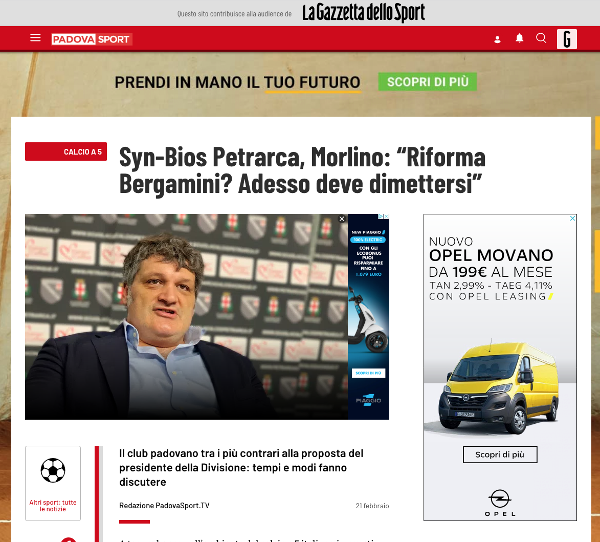 Come si ricorderà, nei giorni scorsi Morlino aveva avanzato una richiesta ufficiale per accedere agli atti votati dal Consiglio Direttivo, deciso a intraprendere l’iter, anche legale, per bloccare questo processo che minerebbe pericolosamente la competitività del massimo campionato impoverendo di conseguenza non solo la Serie A ma anche le altre categorie nazionali. Morlino, per dirla tutta, starebbe montando la sua personale battaglia nei confronti della Divisione Calcio a 5: è quello che si interpreta dalle note stampa comparse nella giornata odierna sulle principali testate padovane, cartacee e web, in cui il patron petrarchino, a caratteri cubitali, “invita” il presidente Bergamini a dimettersi.