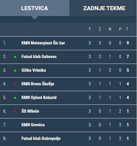 Una sola squadra al comando dopo tre giornate nel massimo campionato sloveno. E' la Meteorplast Šic bar. La squadra dell'allenatore Robert Grdović ha vinto 6-3 a Sevnica, all'intervallo il match era 1-5 per gli ospiti. La squadra di casa ha abbozzato una buona reazione nella ripresa, ma era ormai troppo tardi.