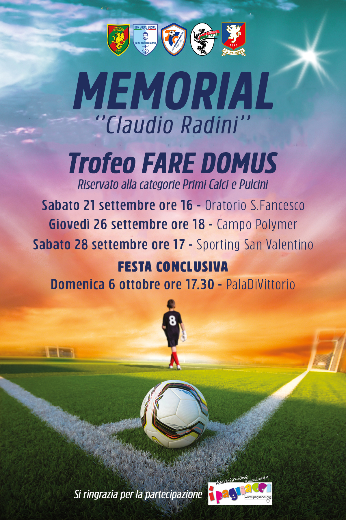 Siamo lieti di annunciare anche la partecipazione dell’Associazione I Pagliacci, che ringraziamo vivamente per il loro prezioso contributo. Grazie alla loro presenza, i bambini e il pubblico potranno godere di momenti di intrattenimento e divertimento, rendendo l’atmosfera del Memorial ancora più gioiosa e speciale.