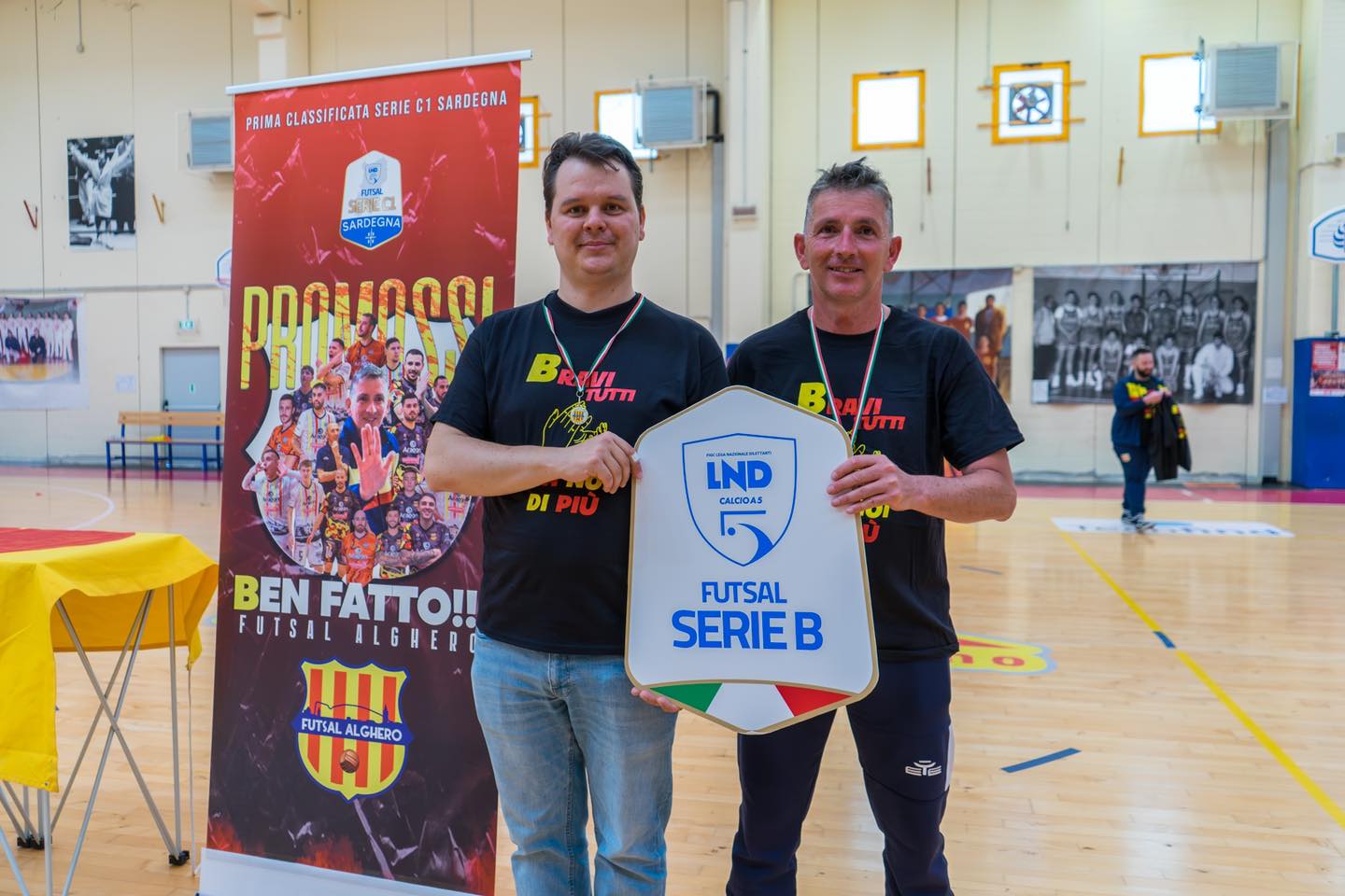 Nella foto di Mauro Madau: il presidente Andrea Columbano (a destra) con il padre Toti, presidente onorario della Futsal Alghero